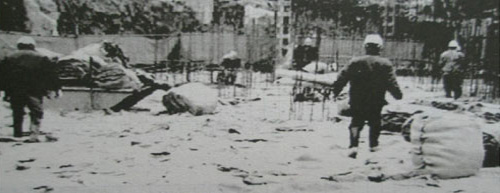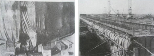 圖-8 施工時采用篷布擋風(fēng) 圖-9 施工后采用外掛麻袋