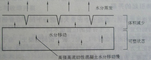 如果混凝土溫度比氣溫高(因陽光暴曬或其它原因,比如攪拌車到現(xiàn)場后,混凝土長時間不能澆灌入模,水化已經(jīng)開始),即使氣溫涼爽且相對濕度為100%的飽和條件下,水分從混凝土表面蒸發(fā)的速率也相當(dāng)可觀,因此,在涼爽、潮濕的氣候下混凝土也可能出現(xiàn)塑性裂縫。